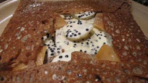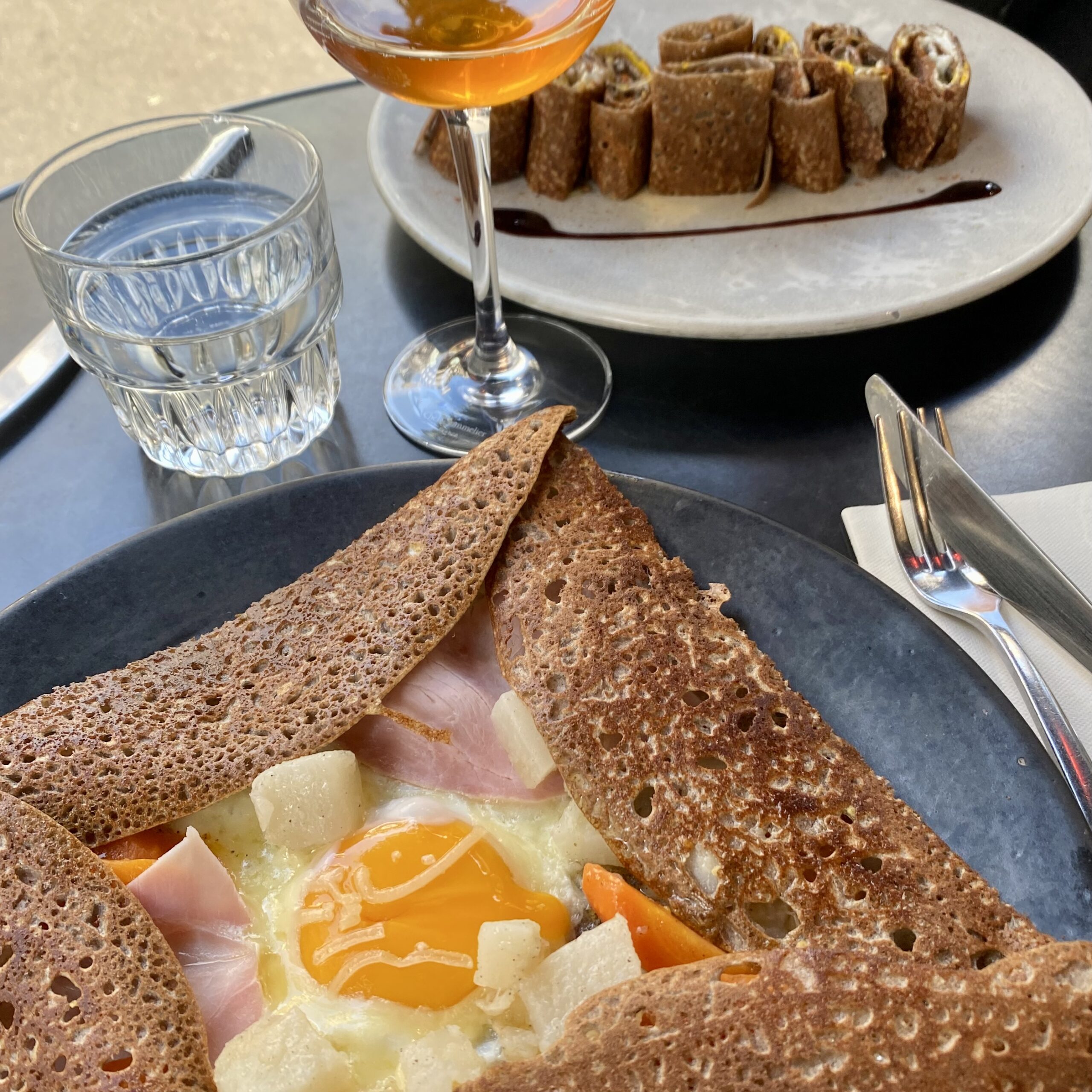 Breizh Café is by far our favorite crêperie in Paris. Traditionalists like me, who always order a complète (ham, cheese, egg), appreciate the higher quality organic ingredients and the crispy lacy edges of their buckwheat galettes. We’ve included Breizh Café among our favorite restaurants in Paris.