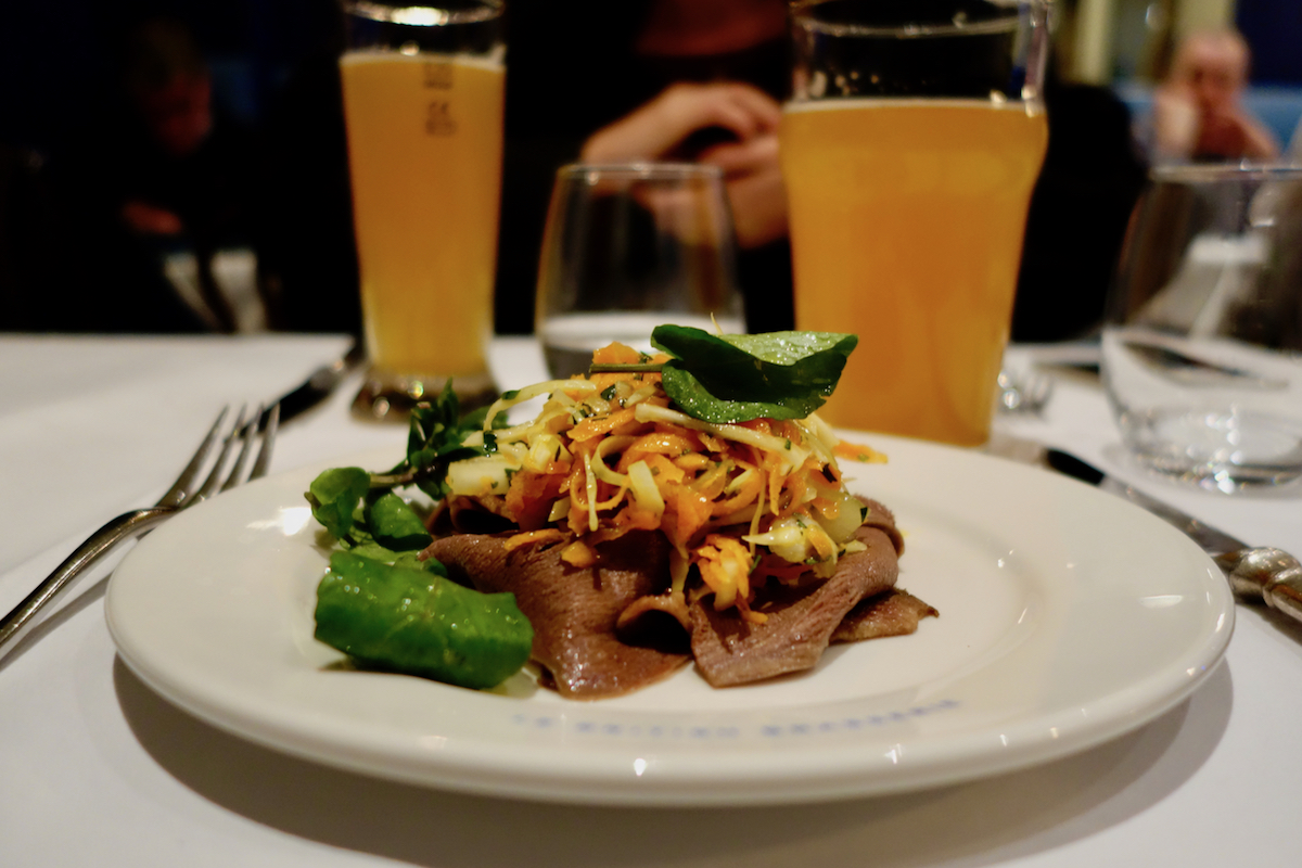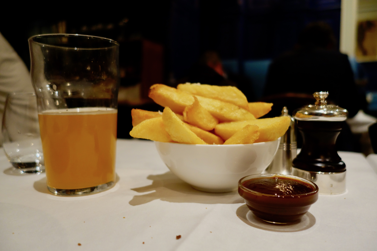 L’Entente’s founding proposition is to source English recipes with fine French ingredients. Good sourcing, alas, couldn’t save the under-seasoned ox tongue salad, nor some almost flavorless Scotch quail eggs. More successful are the restaurant’s gargantuan fries, each the size of a roofing beam, and the shepherd’s pie, a harmonious execution that transcends the genre of hachis parmentier. Chef Matt Ong (from the now closed Brit-themed restaurant Albion) prepares workmanlike British comfort food that any pub-goer would pounce upon. But in L’Entente’s over-lit subcontinental tearoom interior, these staples have an uncomfortably ironic aftertaste; one feels vaguely like the subject in Pulp’s “Common People.” The wine list gives no indication of Woodhead’s experience at more wine-savvy restaurants; for now it is a conventional hodgepodge of mass-market selections one might find at a family restaurant in the UK. Beer, perversely, comes not from the UK but from Brasserie de la Pigeonelle, a rustic Loire-based brewery whose chief supporters are the natural winemakers whose wines are entirely absent from L’Entente’s list.