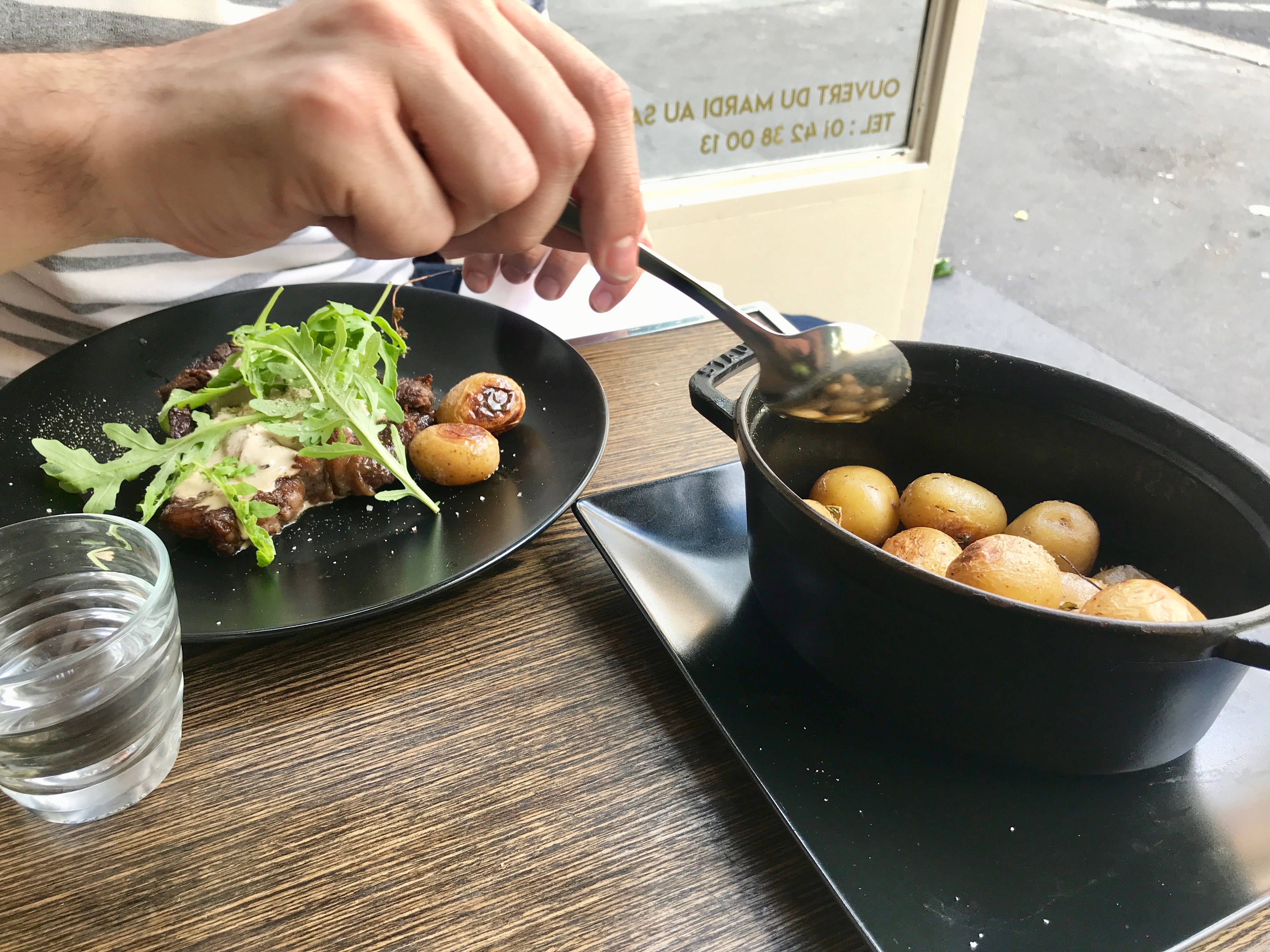 My cousin and I decided to us PBM to find a great lazy minute booking outside because the weather in Paris has been stunning this week. Philou was a slam dunk! We called and they had the best outside table reserved for us for an hour later that night. It has a great neighborhood feel and we were the only American accents in there that night. The wait staff was fun and kind with our weak attempts at French and directed us towards their favorites for the evening…Light flavorful fois gras made in their kitchen with this delightful brioche and miel as a starter. We cleaned the plate. Their ‘steak and potatoes’ Normandy beef with mushrooms and small potatoes was savory and a hearty portion, larger than many I’ve had here. We let them pair our wine carafes with each course and are glad we did. All in all a memorable meal and perfect choice. A great experience in the 10th!!!